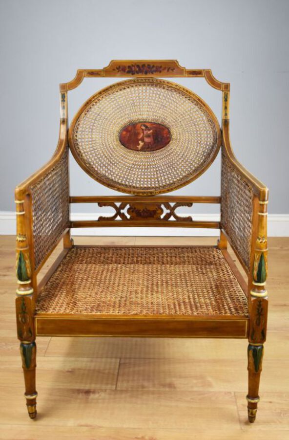 For sale is a good quality Victorian Satin Birch Cane armchair By Howard & Sons of Berner Street. The chair has an ornately hand-painted frame with caned seats, sides and back, the centre of the back has a decorative hand-painted panel showing a girl and her dog. The chair stands on brass castors and is in very good condition for its age, with all of the can seat and sides remaining intact and the frame is structurally sound. The chair is stamped Howard & Sons, serial no. 17346 9132.