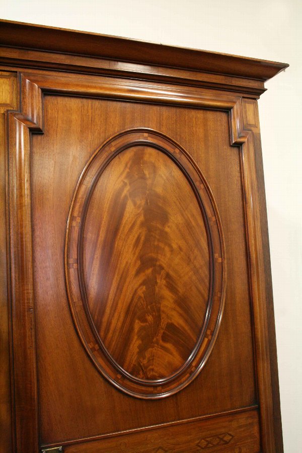 Circa 1890, very unusual Aesthetic Movement mahogany two door wardrobe. The top with its simple shaped moulded cornice. The fore edge of the cornice has a slight geometric pattern in it using the timbers in different grains. At the front there are two panelled doors, with oval panels on the top, rectangular panels at the bottom with matching flame mahogany veneers and various geometric and inlaid panels. The quality of the doors is superb with large thick solid mahogany. The hardware is very stylish with a scrolling handle on a rectangular escutcheon with proud brass round head screws and a working key. Unusually, when the doors open there is a cut out for a flat section between the two doors and also left and right of the door. Inside the wardrobe on the right hand side there is hanging and drawers in the base. The left hand side is hanging, with a mirror on the inside of the door. Beneath the two doors there is an ogee moulding and two drawers with stylish swan neck handles with a rectangular back plate, and an inlaid panel in the centre. All standing on an enclosed plinth which is rounded at the front and flat at the sides. The wardrobe has fielded panel back. Excellent colour and wonderful quality.