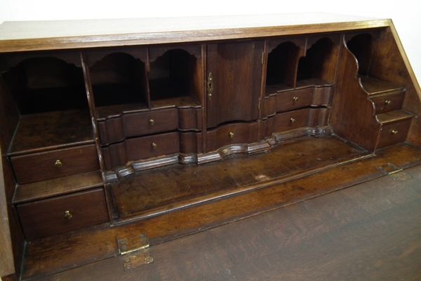 Circa 1770, early George III oak bureau, with polished top and flap with a large stylish escutcheon, opening to reveal a very stylish interior which has various shaped drawers and a shaped concave central door. Outside is a configuration of 2 over 2 drawers with swan neck handles, a simple frieze and standing on bracket feet. (Alterations).