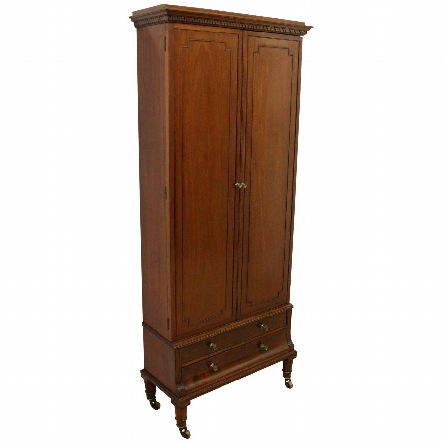 Circa 1900, very unusual Edwardian cheval mirror/dressing cabinet. The two panelled doors open to reveal the bevelled glass mirrors, all above two concave drawers. All standing on turned supports with brass castors.
