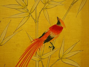 Dated last quarter 20th century, a pair of folding screens with wallpaper to the back in a bird and Japanese styled motif. They are hinged to the front, and display a variety of birds, bamboo, butterflies and floral landscape on a vibrant yellow background. The screens have 3 folds each and can be separated or used side by side.