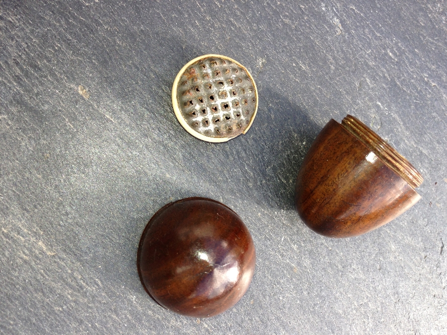A lovely early 19th century pocket nutmeg grater in the shape of an egg turned from rosewood. Top half unscrews to reveal the grater which itself unscrews for storage of nutmegs. Pocket nutmeg graters were popular in the late 18th and early 19th century when mulled wine was popular. A great piece of antique treen.