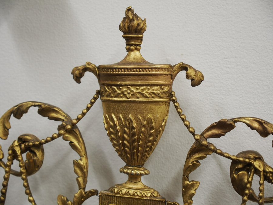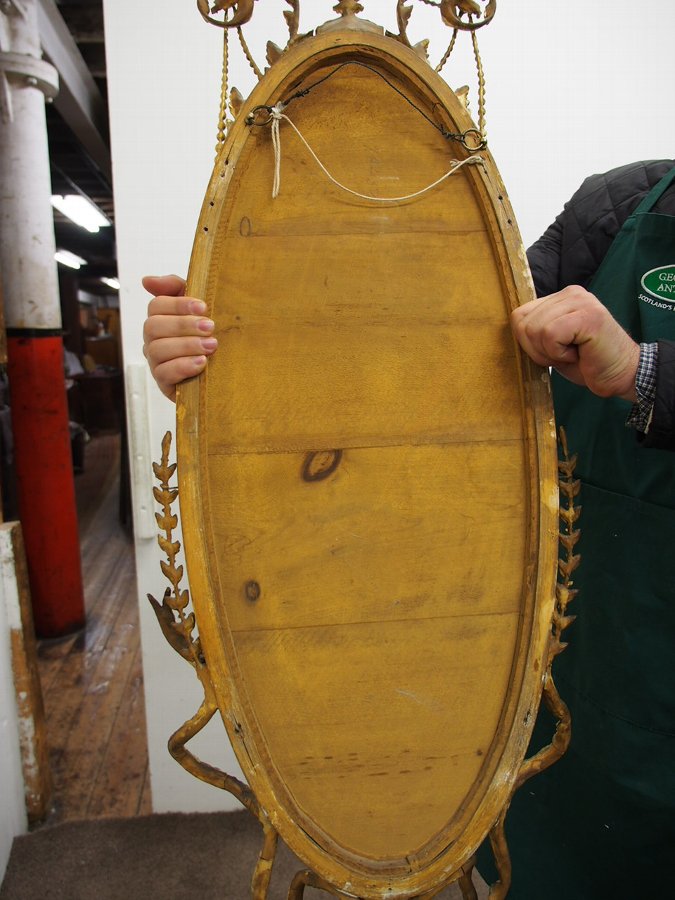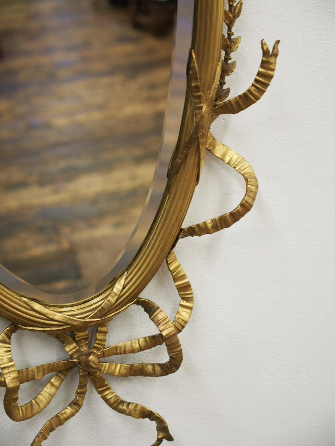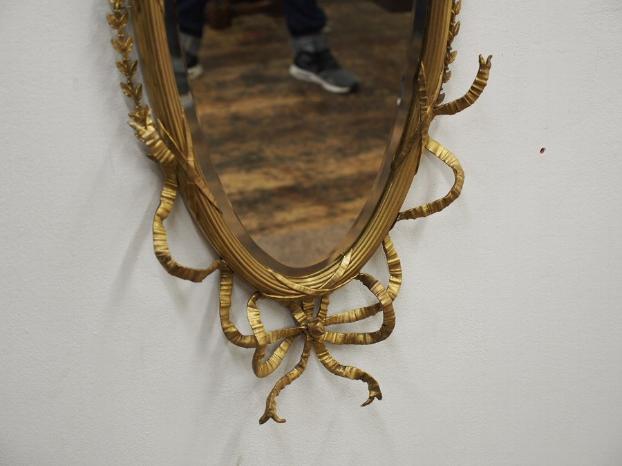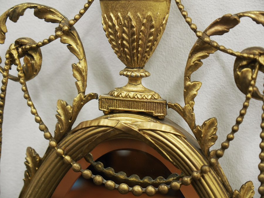 Circa 1890, large Adams style, gilt framed wall mirror. The bevelled edge mirror is surmounted by a well carved classical urn frame, Adams style decorations of swags and tails and Rococo beading either side. The base features a large carved gesso ribbon and finely carved bell drops.