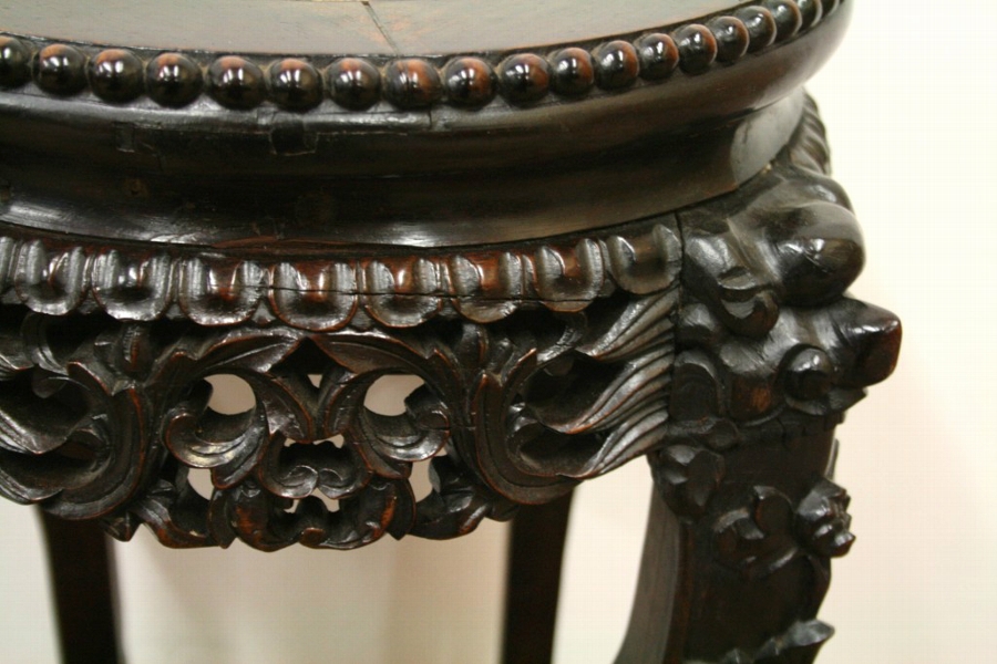 Circa 1900, neat sized Chinese carved hardwood stand with variegated pink marble top with beaded edge, standing on carved cabriole legs on ball and claw feet.