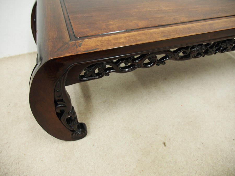 Circa 1890, Chinese rosewood kang table. With open scrolled ends, it has open carved aprons with dragon and foliage motifs. The fielded-panel top has a well figured grain, with an excellent colour and patina.