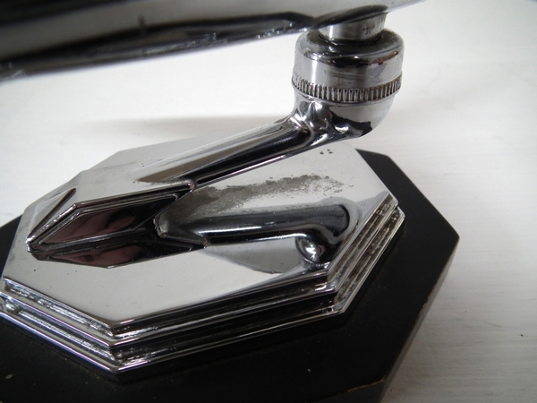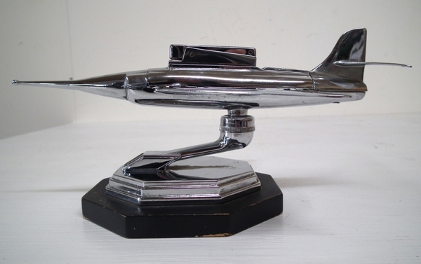 Circa 1950, chrome plate desktop cigarette lighter in the form of a fighter jet, standing on an ebonised plinth. What an iconic piece!