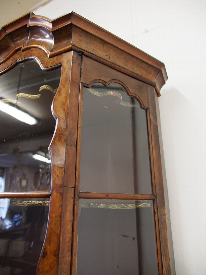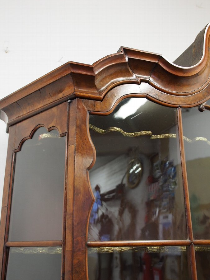 Circa 1820, Dutch display cabinet or bookcase in exceptionally figured walnut. The serpentine moulded cornice is surmounted by a carved cartouche, above a pair of arched rectangular glazed doors with shaped frames opening to the shelved interior. The bombe base has three long graduated drawers flanked by cupboard doors, and the shaped apron has a carved central portrait medallion. It is all raised on bold paw feet and has its original rococo style bronze handles and escutcheons.
