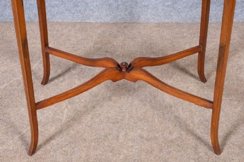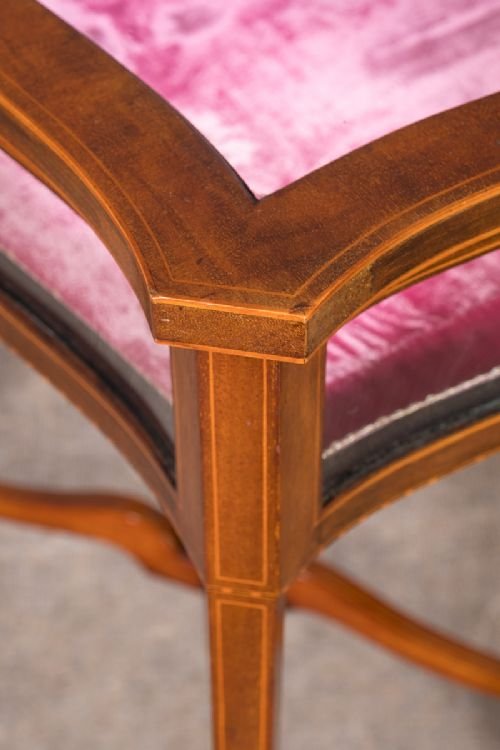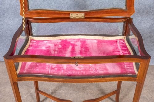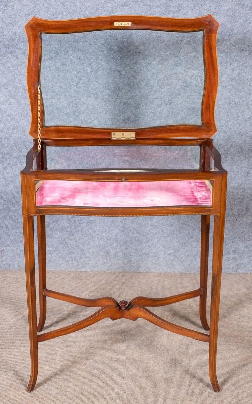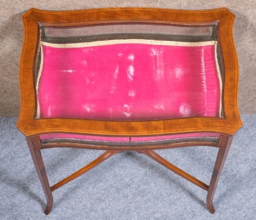 A good mahogany inlaid Edwardian Period bijouterie cabinet of serpentine form and having a shaped and cross banded glazed top with 2 lines of boxwood stringing. The lid opens via a working lock and key to reveal the lined interior with four serpentine shaped glazed panels and further boxwood outline detail to the sides and front. The whole raised on elegant square tapering and out swept legs and united by shaped and inlaid stretchers. Dimensions:- Height…29’’/ 74cm. Width…24’’/ 61cm. Depth…16’’/ 40cm. Delivery to most of U.K. mainland £45.