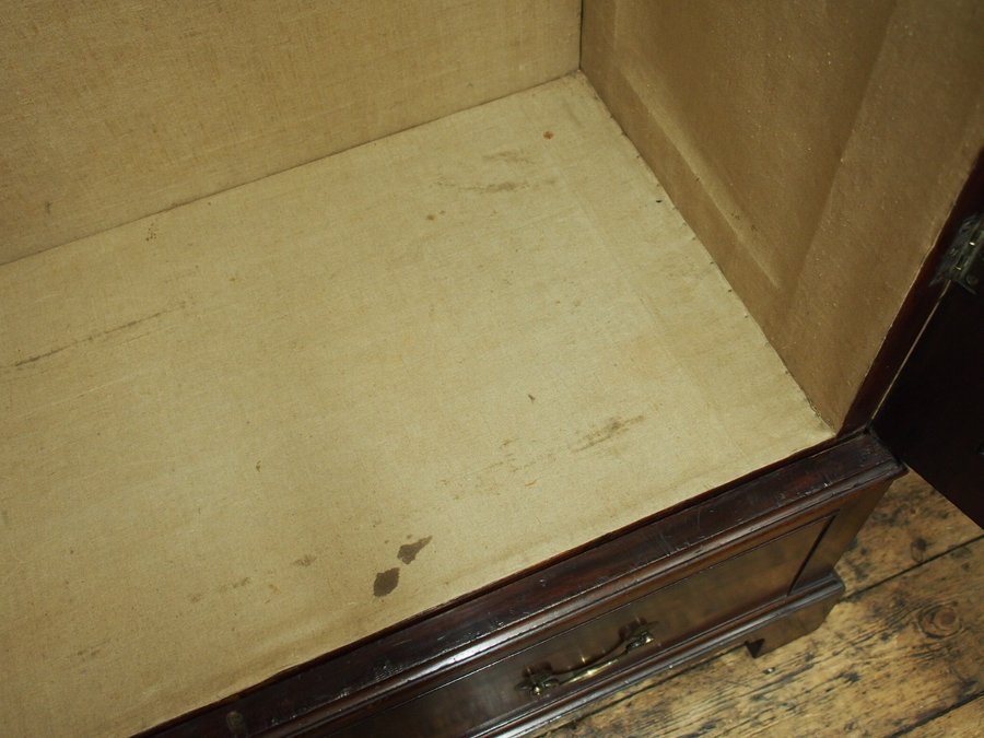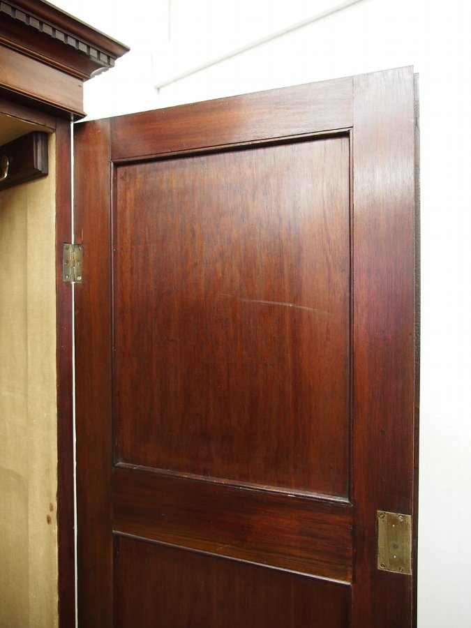 Circa 1830, late Georgian mahogany two-door wardrobe. In finest quality Spanish mahogany with a lovely original patina and rich colour. It has two panelled doors which are surmounted by a simple frieze and a dentil cornice. The base drawer has its original swan-neck brass handles and all standing on original bracket feet.
