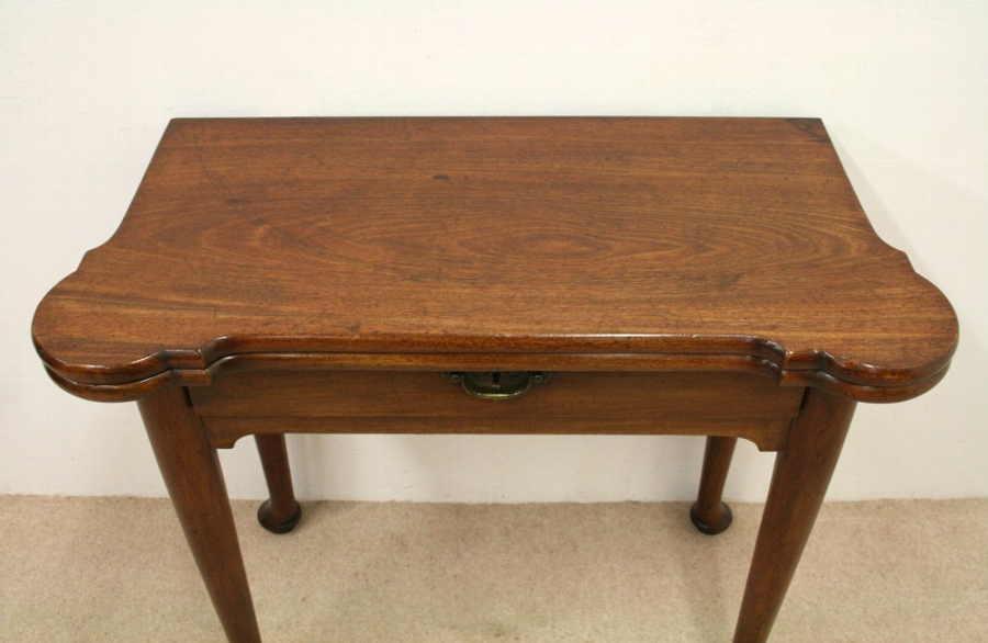 Circa 1760, late George II/early George III red walnut games table, the shaped top opening to show the interior with a guinea well in each corner. One fitted oak lined drawer with original brass handle. Standing on simple cabriole legs on pad feet.
