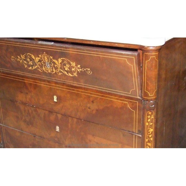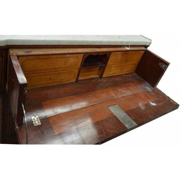 Magnificent Elizabethan comfortable mahogany desk. Adorned with marquetry in the top drawer and socket. The desk has 5 drawers made in lemongrass. At the top, Carrara marble top.