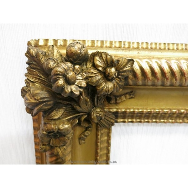 Marco Elizabethan wood and burnished gold leaf. Presents entornchado relief around its perimeter and floral decoration in the corners also in relief.