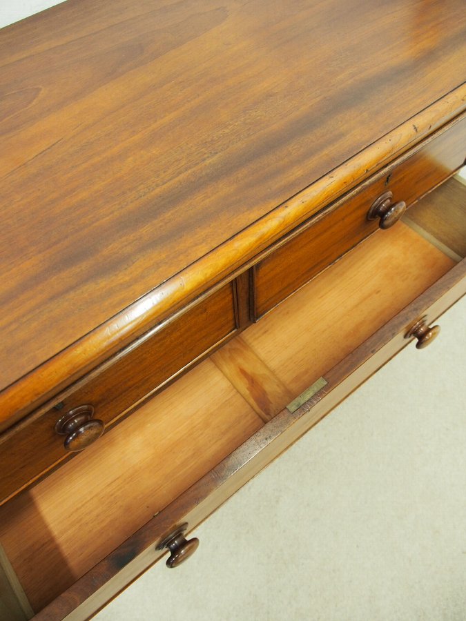 Circa 1880, mid-Victorian chest of drawers in figured Spanish mahogany and of lovely proportions. The rectangular top has cantered corners and a moulding over a simple frieze. With two short and two long graduated drawers and the original wooden bun handles, it all stands over a plinth base with inset castors.