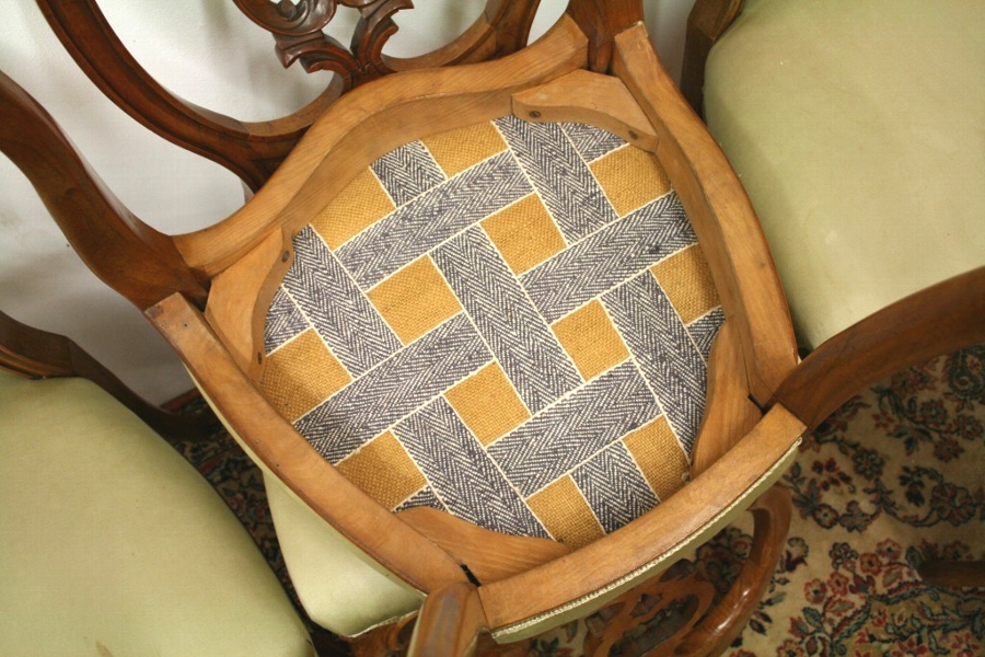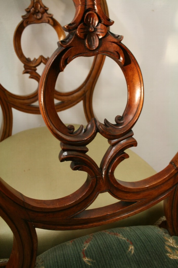 Circa 1880, set of 10 Victorian walnut dining chairs. The oval back has a central carved open splat with fine foliate and Rococo carvings over a stuff over serpentine seat and a simple beading below that runs down to form part of the legs. The front legs are carved and cabriole and there are turned swept legs at the rear. Mellow in colour, excellent condition and sturdy. Four are slightly darker in colour than the other six. Extremely rare to find set of 10 chairs in this style.