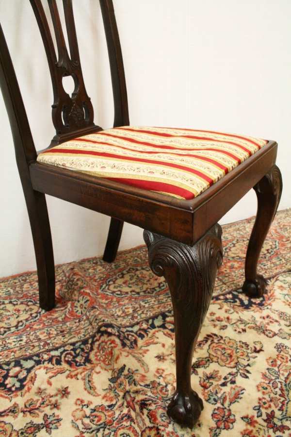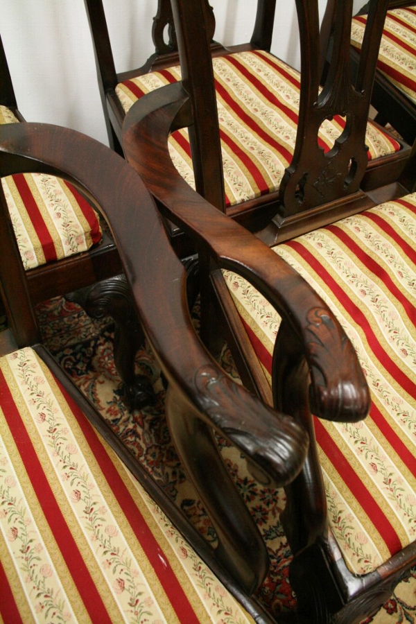 Circa 1900, a neat set of 8 (6 + 2) mahogany Chippendale style dining chairs, with unusual relief carving to top rail and to vertical splats, standing on a cabriole legs with ball and claw feet. Finest Cuban mahogany.