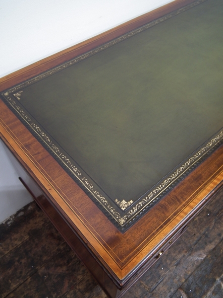 Sheraton revival kneehole dressing table, the colonnaded back between 2 pairs of short drawers with lion mask swing handles, the inlaid kneehole flanked by an arrangement of 7 inlaid drawers decorated with swags on short tapering legs ending in castors.