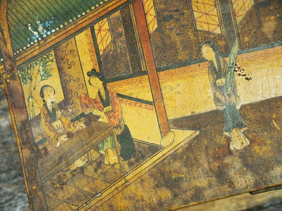 Circa 19th century, hide-covered small travel trunk. With hinged cover, and handles to either side, it is entirely painted with designs of women in traditional robes on terraces. It opens to reveal a patterned interior, with room for storage.