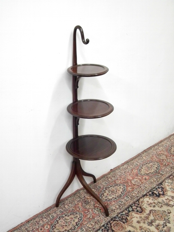 Circa 1900, Sheraton style inlaid tapering cake stand of unusual form. The lifting handle is in the form of a shepherd crook, carved in solid mahogany. Below this the three tiers are also solid mahogany with double inlaid edges, each supported by an elegant bracket. Below the third and largest dish is a tripod base on swept legs with double inlay.