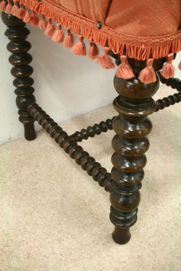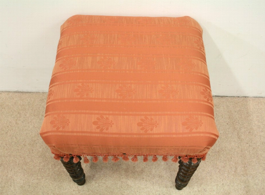 Circa 1850, Victorian bobbin leg stool, with makers label ‘R.Strahan & Co Ltd, Stephens Green, Dublin’. With bobbin turned stretchers.