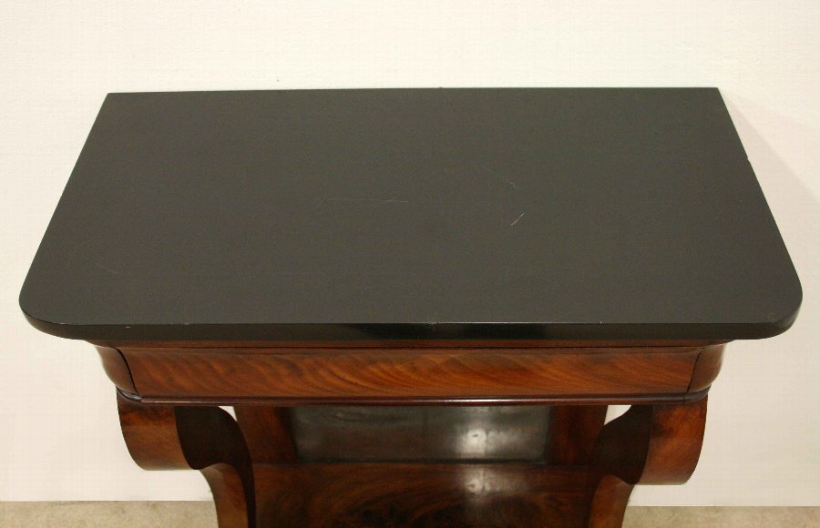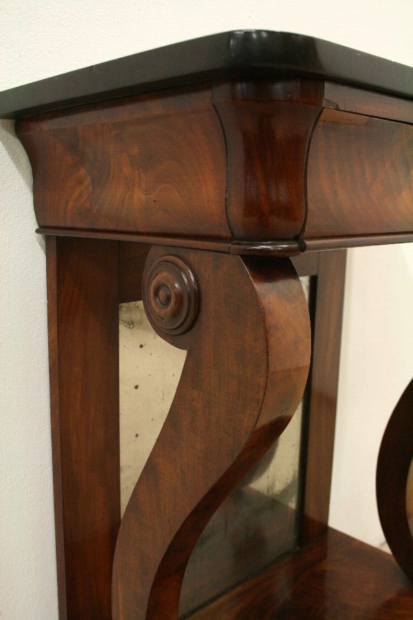 Circa 1830, William IV Biedermeier mahogany and marble topped pier table/console table. The top is rectangular with rounded corners and a polished edge, above an ogee drawer with flame mahogany veneers. Below this there is a back panel framed in mahogany with an original mirror, which is foxed. The table is held in place by a pair of sabre legs, with carved roundels at the top and stylised claw foot. These sit on a raised flame mahogany veneered concave platform base with bracket feet at the back and simple turned bun feet at the front. The table has wonderful colour and patination. Very stylish and its neat size makes it very versatile.