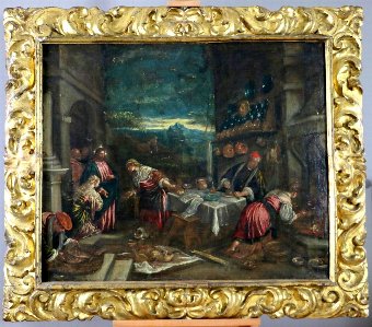 Venetian School of the sixteenth century, Francesco Bassano workshop Christ in the House of Martha & Mary Oil on canvas (112 cm by 94 cm) Important gilt wood frame XVIIth century (144 cm by 126...